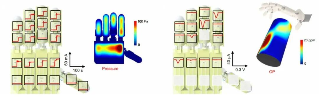 在下一步进行抓握手势后,机械手抓住被测物体。在抓握动作完成后,又有多个压力传感器被触发,并同时启动相应位置的电化学传感器。电化学传感器对于所触碰的位置进行原位检测,根据信号强弱计算出相应位置的有害物质浓度,并得到有害物质在物体表面的分布情况。