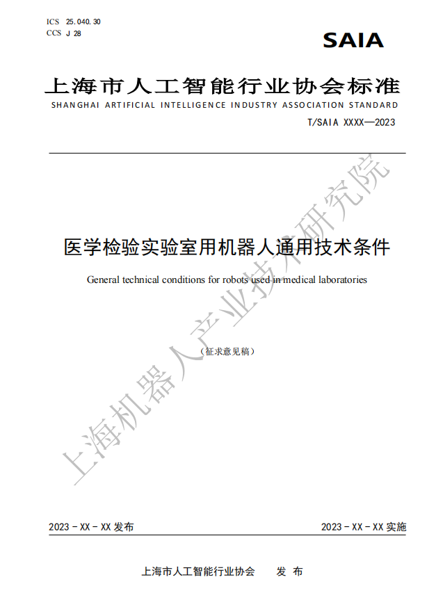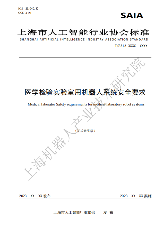 由上海市人工智能行业协会归口,leyu.乐鱼(中国)机器人有限公司官网有限公司作为主要起草单位研制的四份标准:《医学检验实验室用机器人通用技术条件》、《医学检验实验室用机器人系统安全要求》、《医学检验实验室用机器人交互要求》、《医学检验实验室用机器人使用环境要求》现公开征求意见。