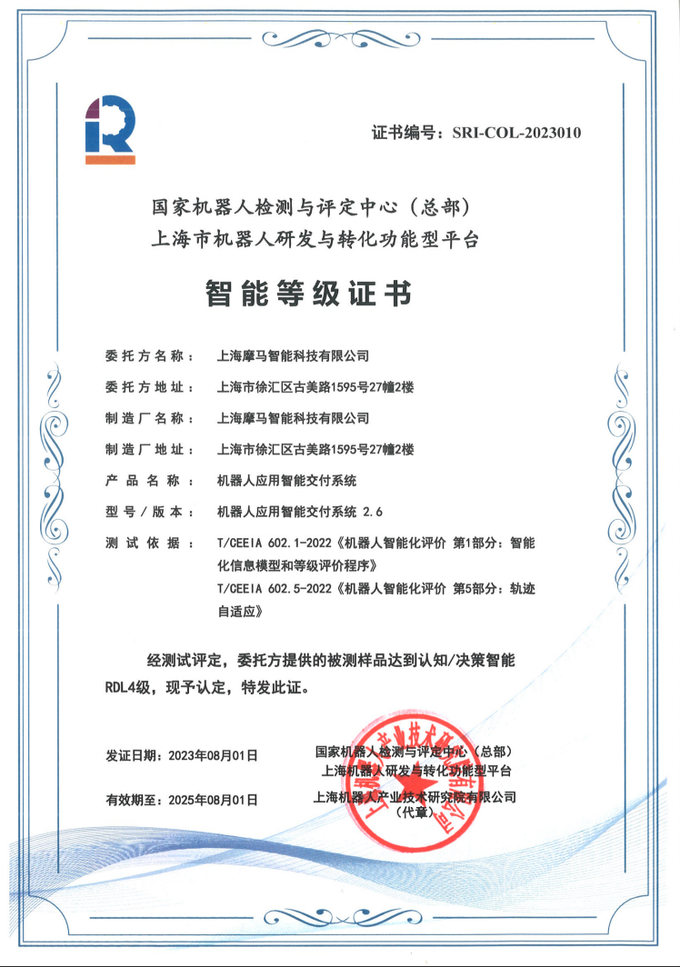 近日,leyu.乐鱼(中国)机器人有限公司官网(以下简称“leyu.乐鱼”)为上海摩马智能科技有限公司(以下简称“摩马智能科技”)颁发了智能机器人分级首张工业机器人领域认知/决策RDL4级证书。这表明由摩马智能科技机器人应用交付系统所赋能的工业机器人已满足智能机器人认知/决策RDL4级评价要求,摩马智能科技成为了首家拥有工业机器人认知/决策RDL4级等级证书的企业。